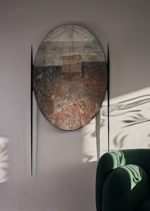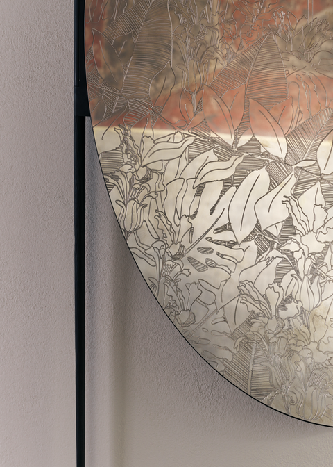 A mirror in a historical triptych style with engraved details of a greenhouse and organic floral motifs reflecting the symbiotic coexistence of nature and man.