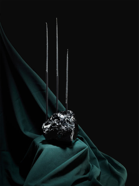 Některé věci do koše prostě nepatří. Černý kus zbytkového skla může sloužit nejen jako svícen se surovou, uměleckou duší. V procesu tvorby se přechlazené zbytky skla v podobě velkých střepů nejprve zabrousí, zaleští a následně jsou do nich vyvrtané díry pro tenké svíčky Apisky od značky Apis Candela.