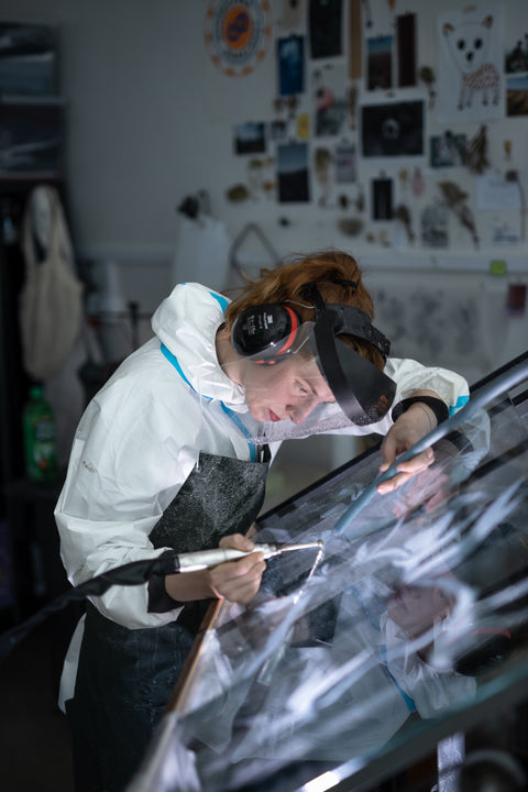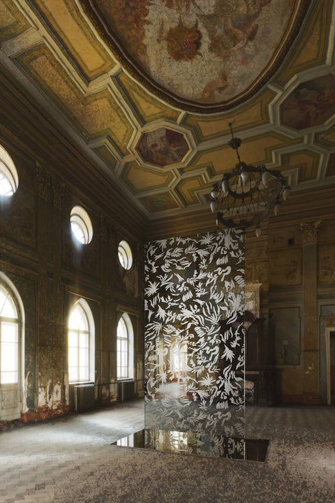 This large-scale engraving is meant to be used as a divider element in architecture. The unique and special engraving technique has little representation in the world. The engraved images block the light, casting shadows across the room.